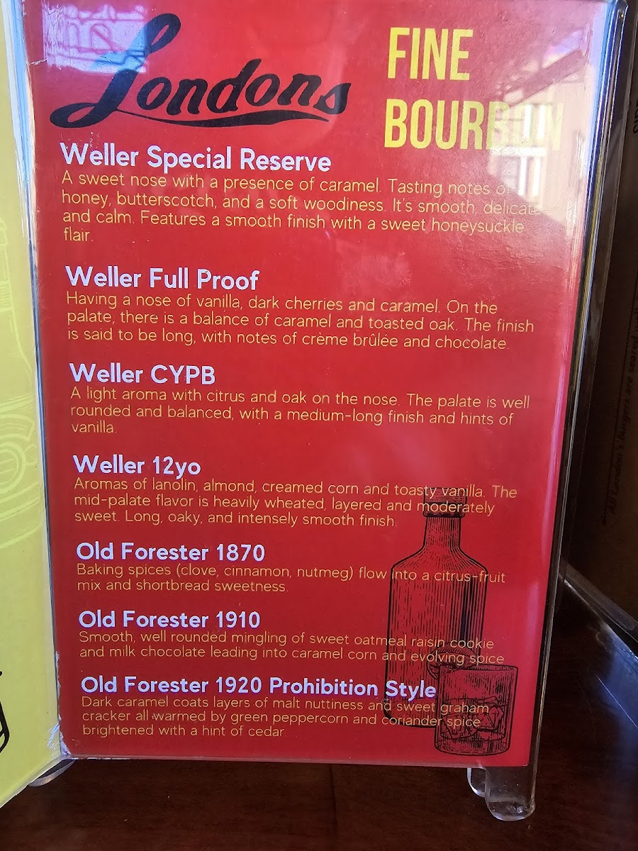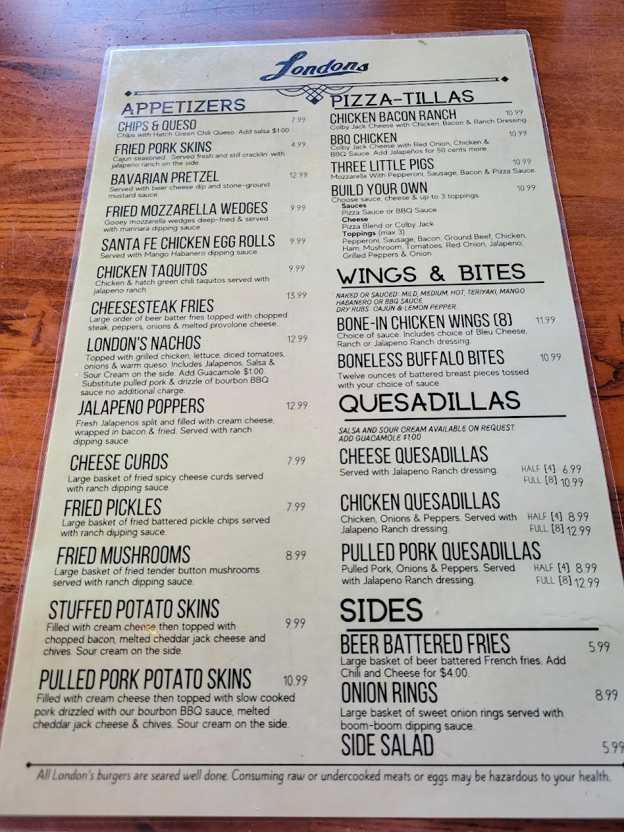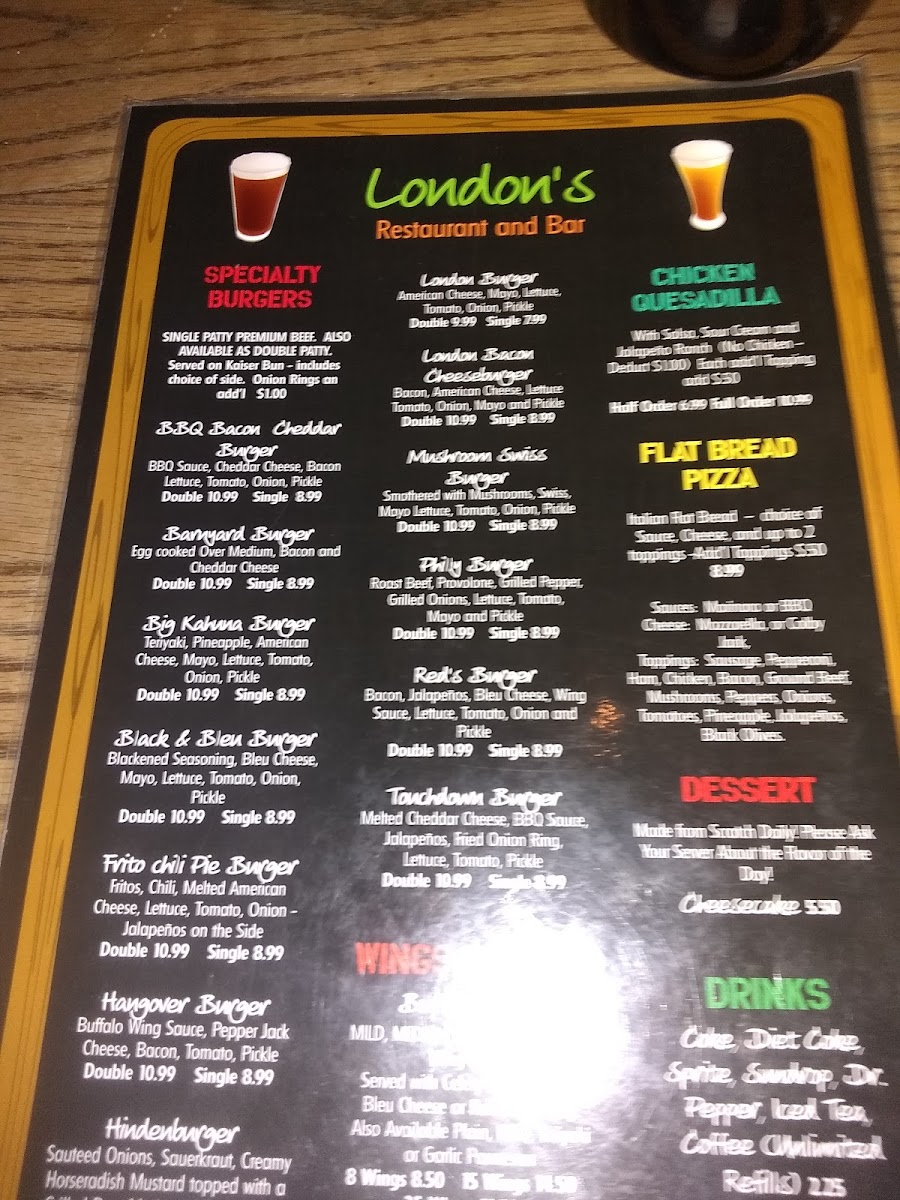 “ We really enjoyed watching the game and having boneless wings and beer at London's!!!! Rick the bartender was AMAZING he was so so BUSY but never missed a step! We will definitely be back. The only downside is that they allow smoking in side. There were only 2 folks smoking so not bad but if there were more that would be a huge downer. But the food and service were GREAT!!!! ”