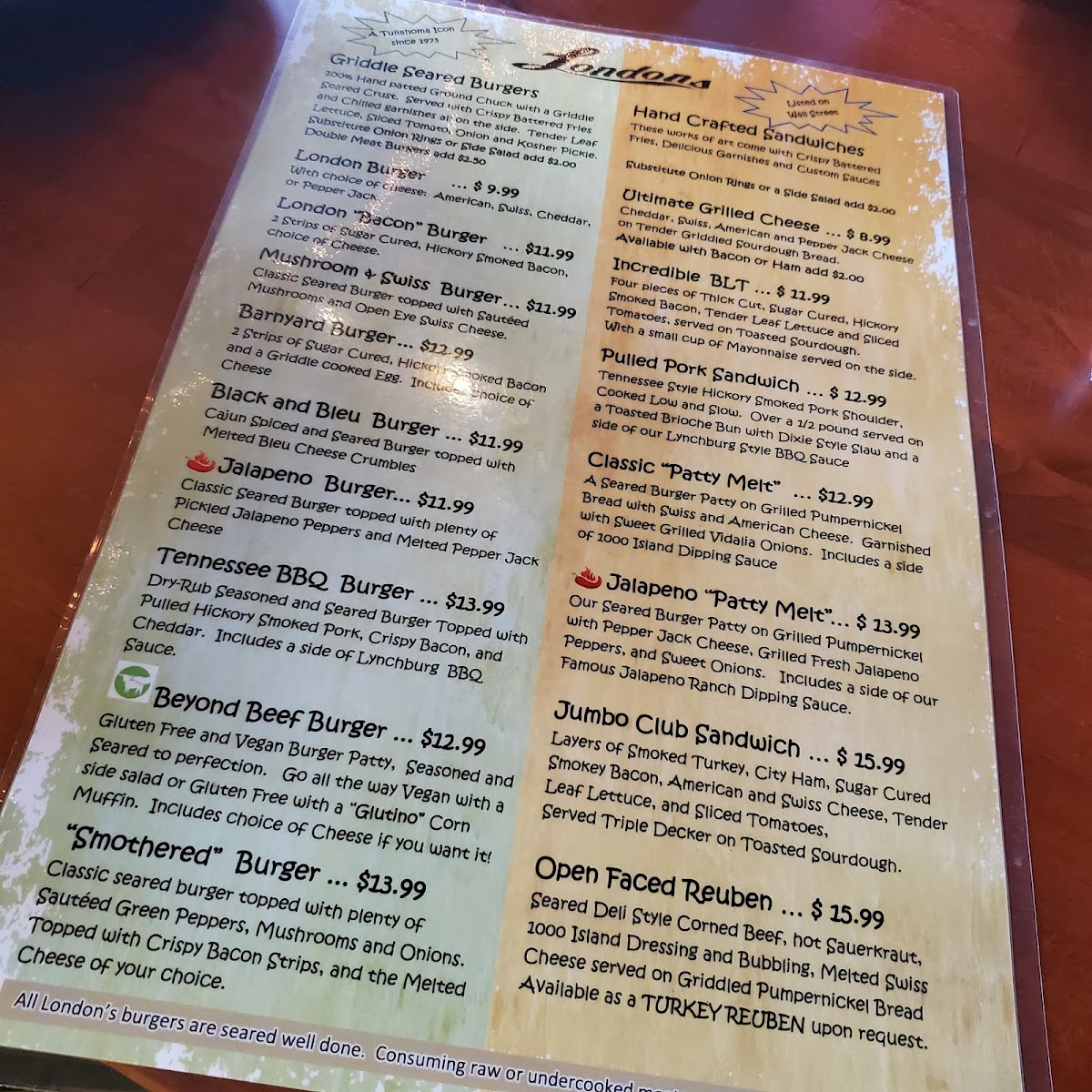 “ Yesterday my wife and our friend went to London's in downtown Tullahoma for lunch. It was the first time my wife and I had been to London's and we were both very impressed! The service was excellent and attentive and the food was great! We had an onion ring appetizer which was hot and excellent. I then had the Cuban sandwich and fries. I thought the sandwich was done perfectly and I really think their French fries were some of the best I ever had. My wife really enjoyed her burger and said it was super tasty. They also gave me a military discount and I appreciate it greatly. Well done London's..... I can see why your so well known in Tullahoma and I'm glad we visited you for lunch. ”